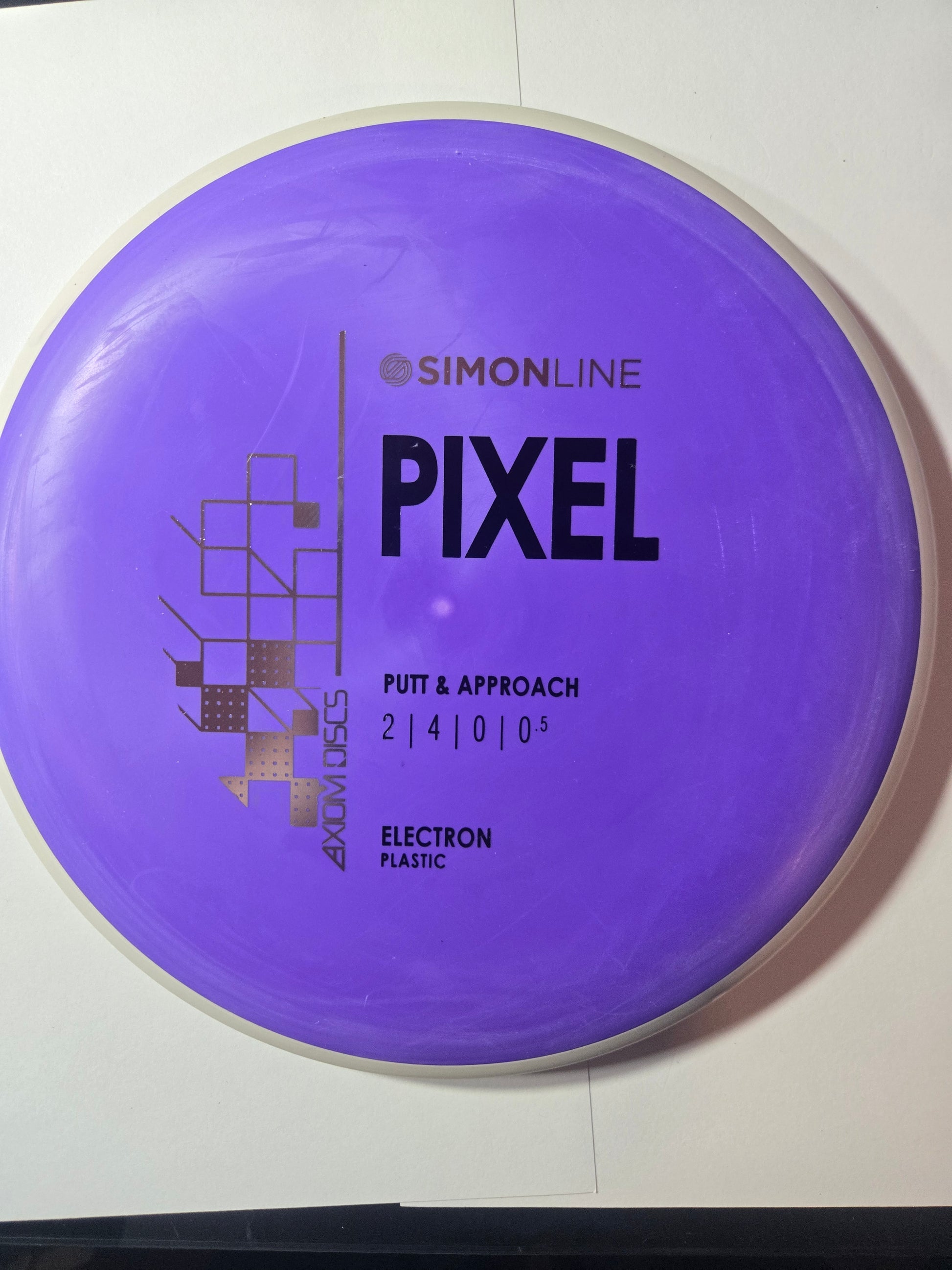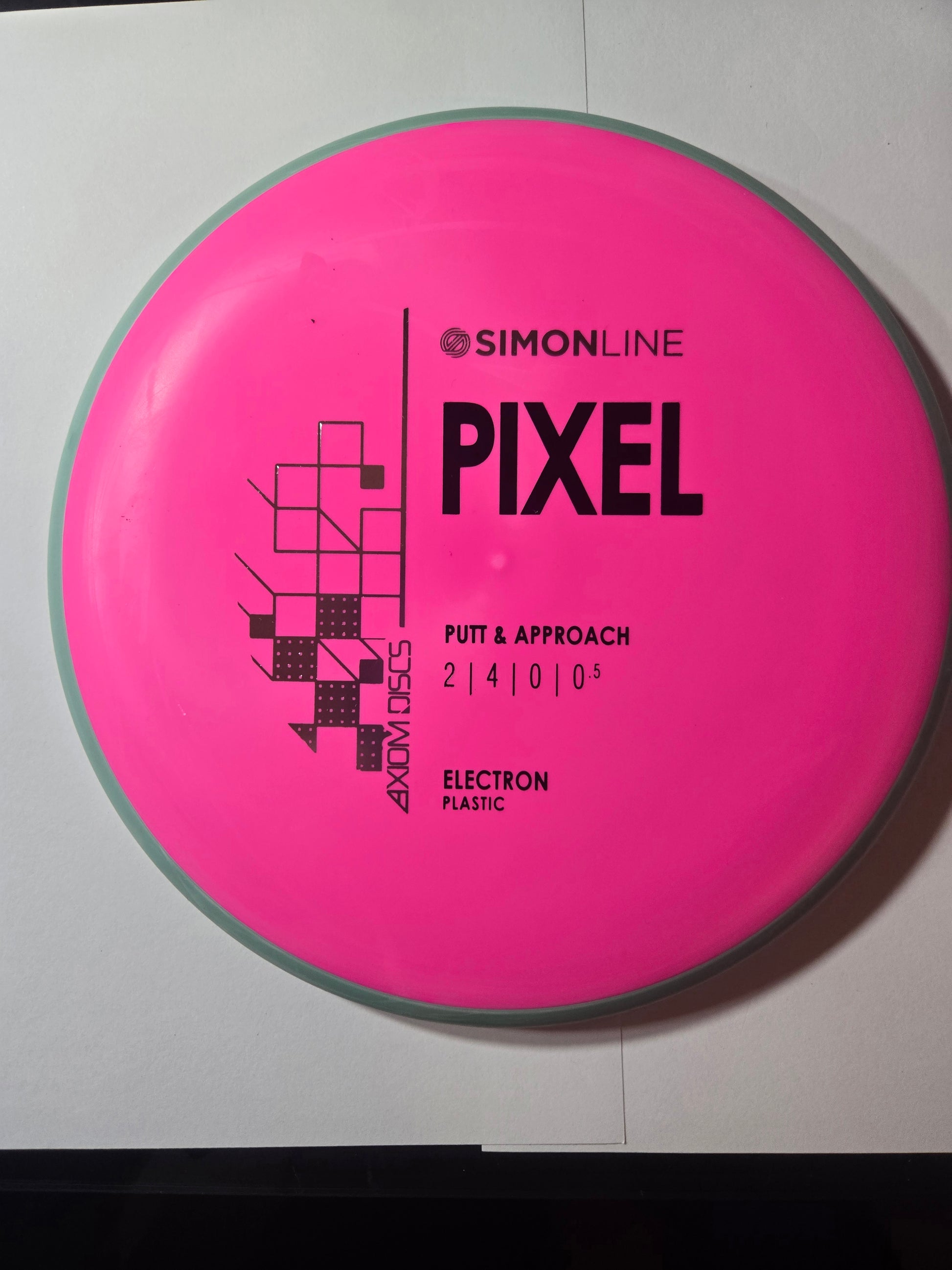 Introducing the Axiom Pixel, the second release in the Simon Line series. It is ideal for players seeking a blend of stability and versatility. The Pixel's design includes a deep profile and a subtle micro bead, ensuring a comfortable and full grip. Suitable for both driving and putting, it offers a straight and stable flight path, maintaining any line with minimal fade. Despite its low speed rating, the Pixel is capable of impressive distances, especially in varied wind conditions. On the putting green, whether in Circle 1 or Circle 2, its optimal glide effortlessly carries it into the chains.
